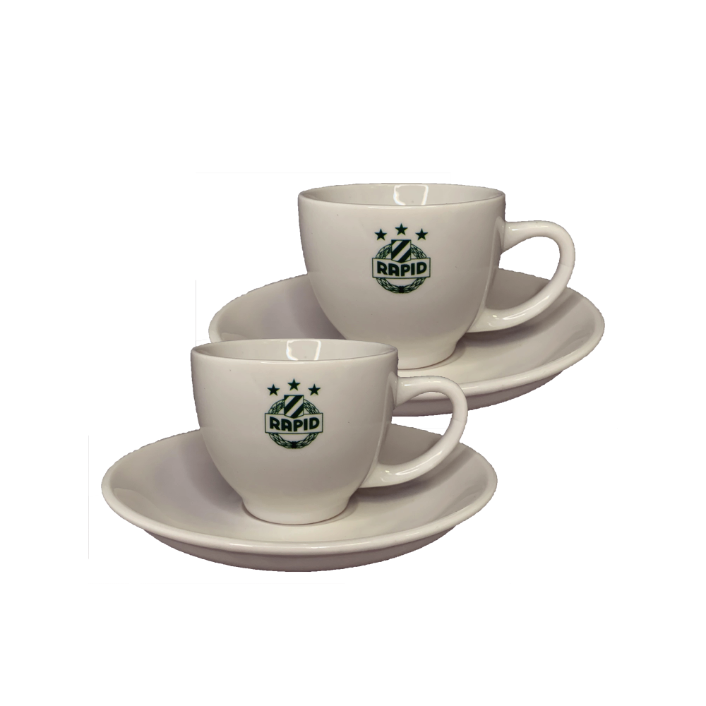 Set bestehend aus zwei weißen Espressotassen mit grünem Rapid-Wappen und zwei weißen Untertassen.