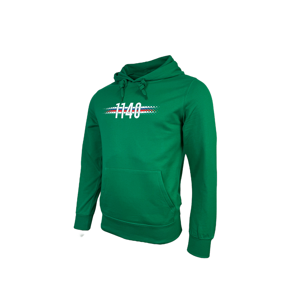 Grüner Hoodie mit Aufdruck 1140 auf der Brust und WIEN WEST HÜTTELDORF am Rücken.