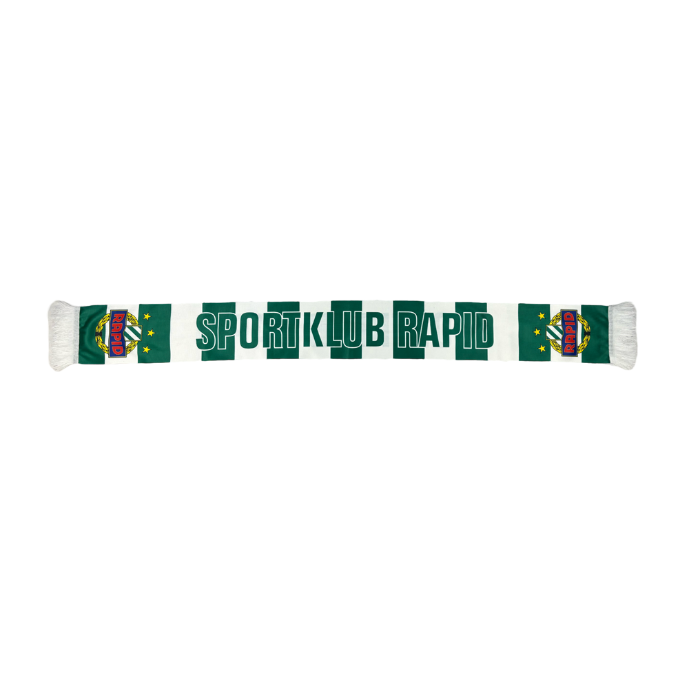 Grün-weiß gestreifter Schal mit dem Audruck "SPORTKLUB RAPID".