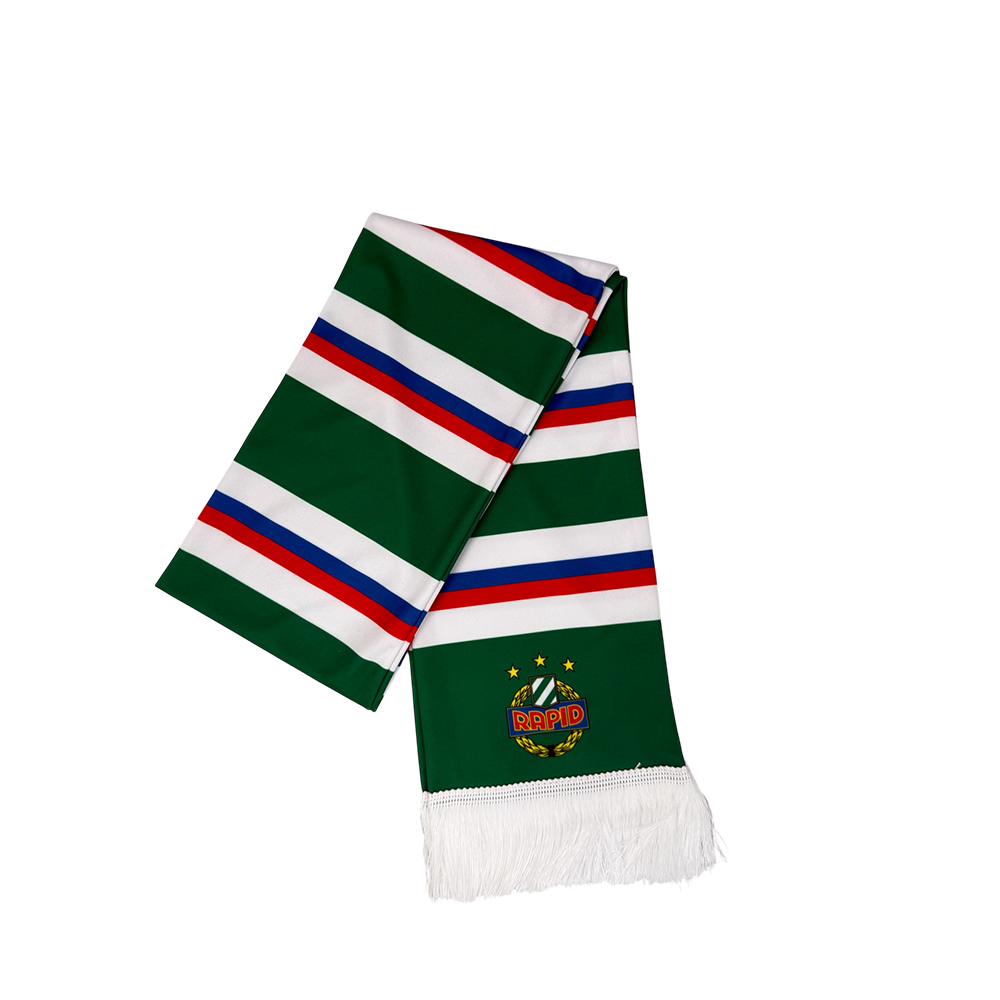 Druckschal mit grünen, weißen, roten und blauen Balken, sowie mit gedrucktem Rapid-Wappen.