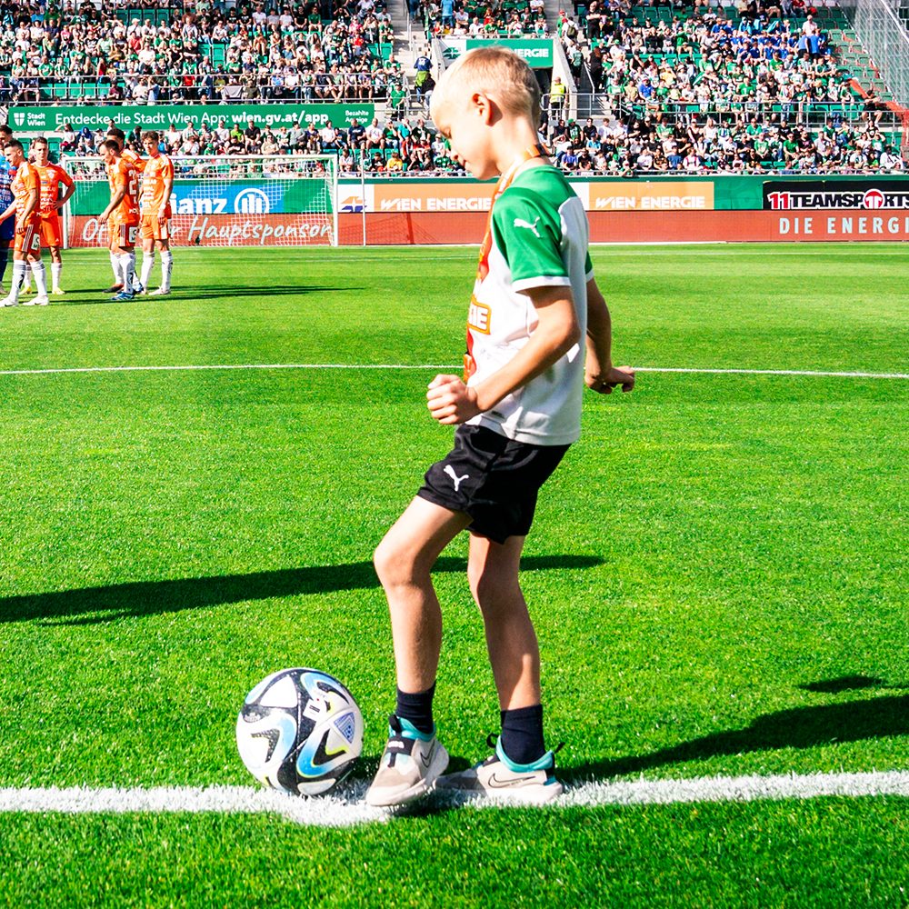 Ein einzigartiges Erlebnis! Kurz vor Spielbeginn gibt es den Ehrenanstoß am Spielfeld gemeinsam mit einem Spieler des SK Rapid.