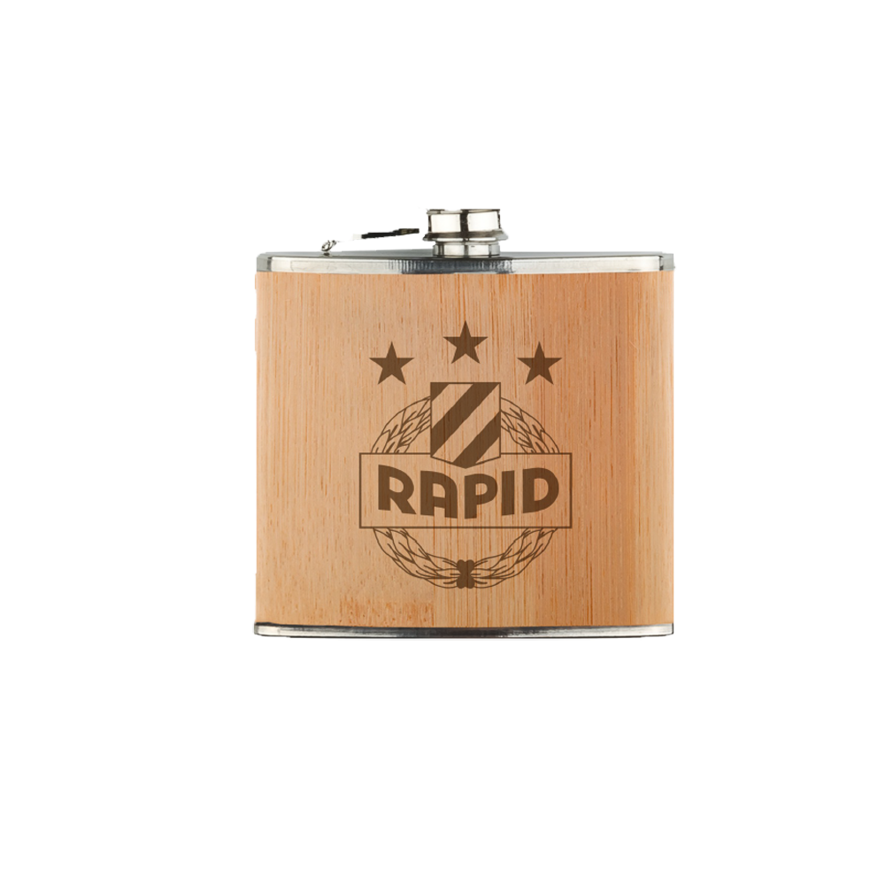 Edelstahl Flachmann mit Bambus-Überzug und graviertem Rapid-Wappen.