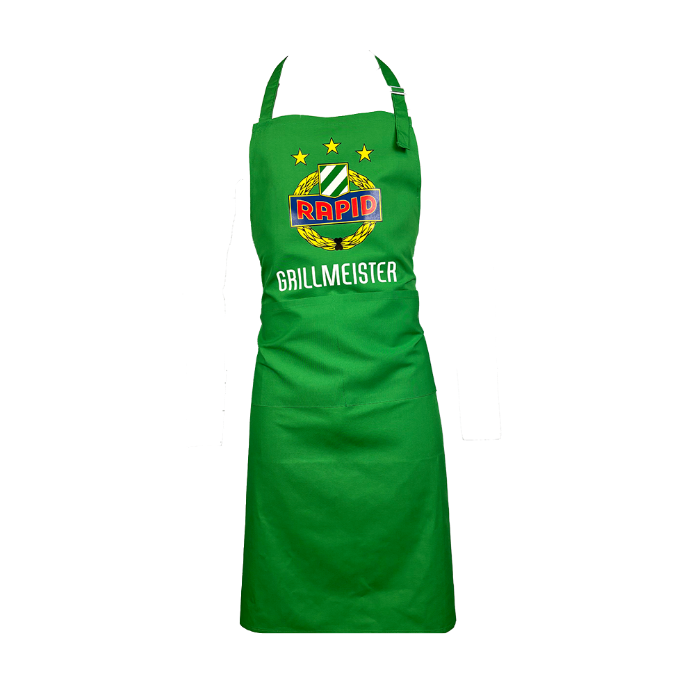 Hochwertige grüne Gastro-Latzschürze mit aufgdrucktem Rapid-Wappen und dem Schriftzug GRILLMEISTER.