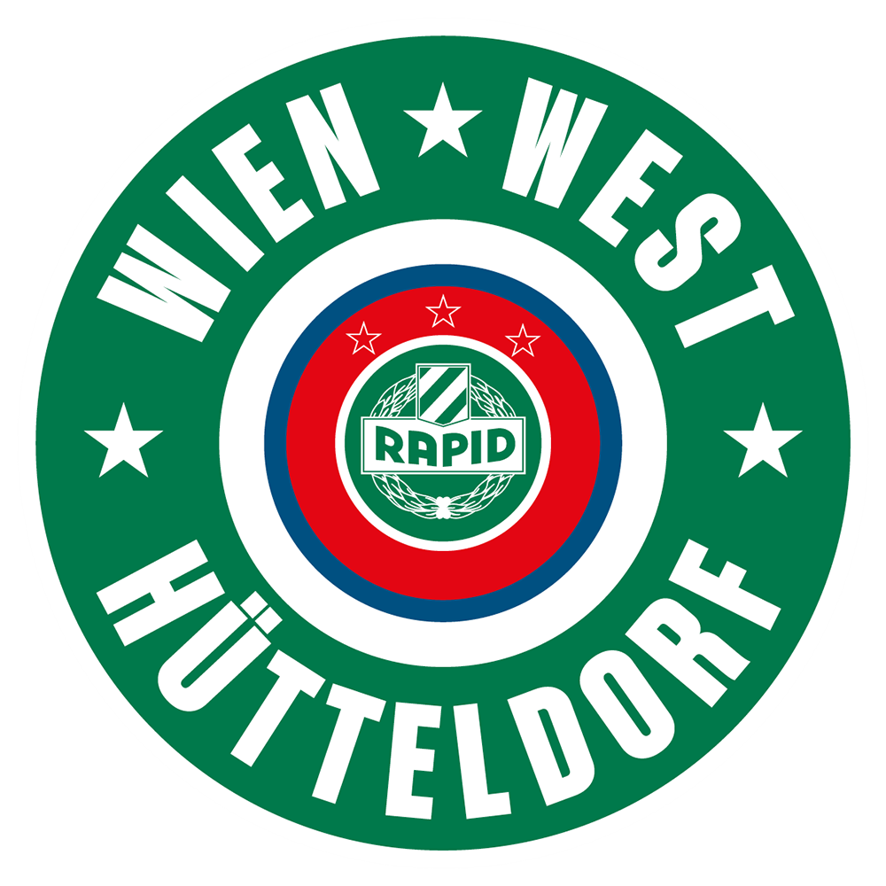 Runder Aufkleber in grün-weiß-blau-roten Streifen mit Rapid-Wappen und Schriftzug WIEN WEST HÜTTELDORF.