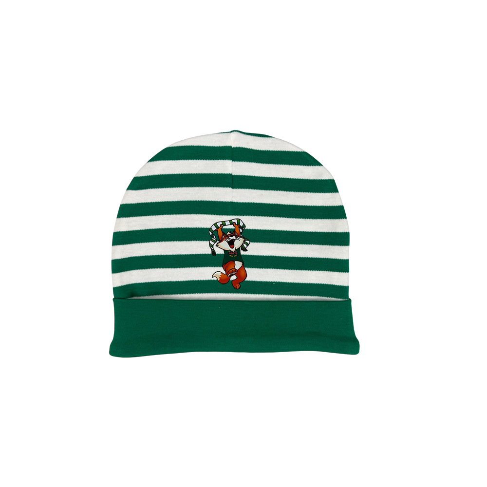 Grün-weiß gestreifte Baby Haube mit Fuxiii Aufdruck.