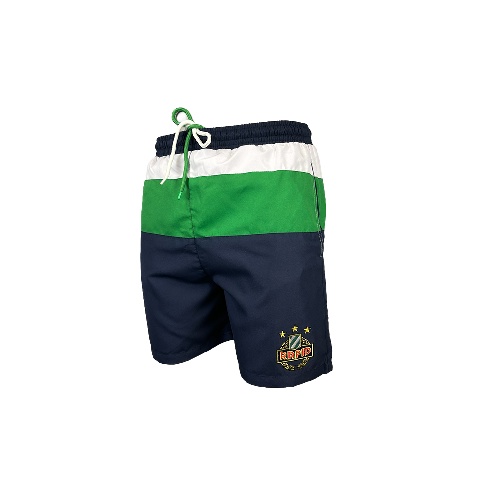 Moderne Badeshort mit gesticktem Rapid-Wappen, zwei Einschubtaschen, elastischem Bund mit Kordel und Innen-Netzhose.