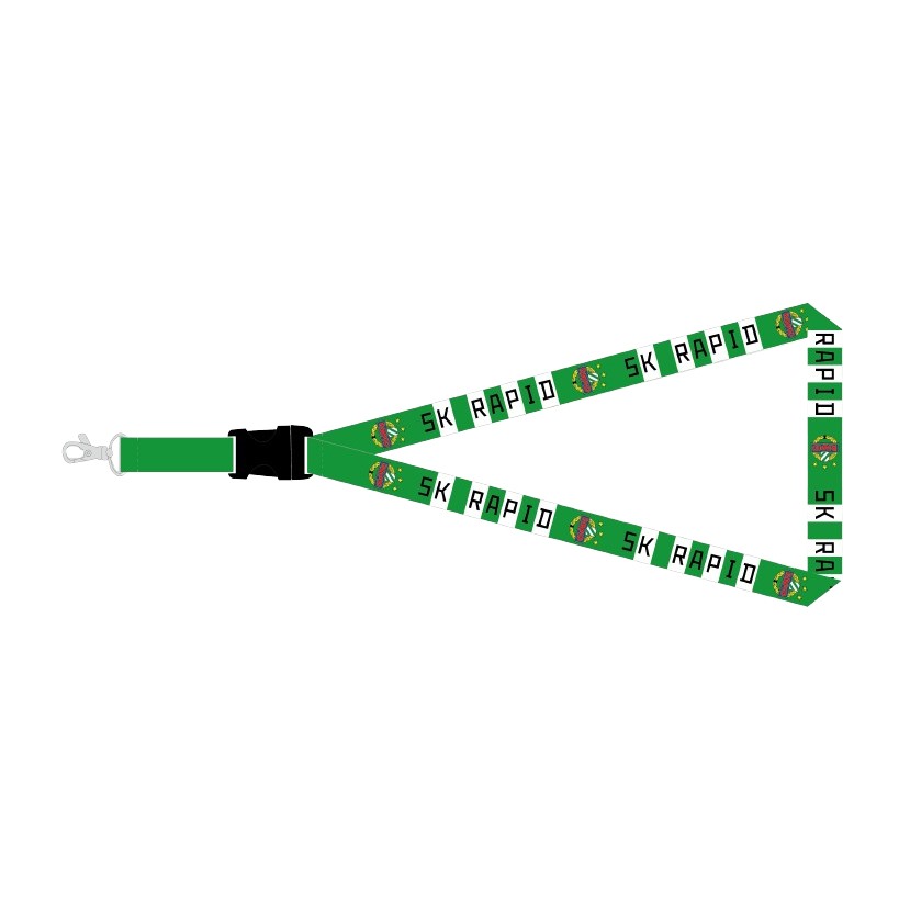 Grün weiß gestreiftes Schlüsselband mit dem Schriftzug SK RAPID und SK Rapid-Wappen.