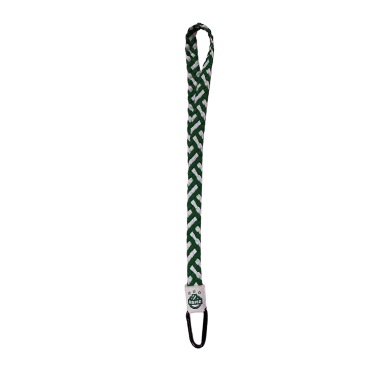 Stylishes Lanyard aus grün-weiß geflochtenem Tau – veredelt mit einem Rapid-Wappen an der Verbindung zum hochwertigen Karabiner. Perfekt für Schlüssel, Ausweise & Co.