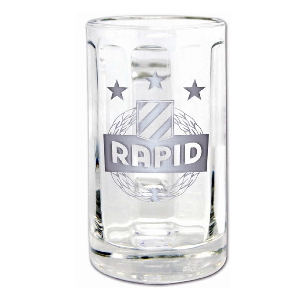 Handliches Bierseidel mit eingebranntem Rapidwappen in Ätzweiß, optisch ähnlich einer Gravur, 0,5l.