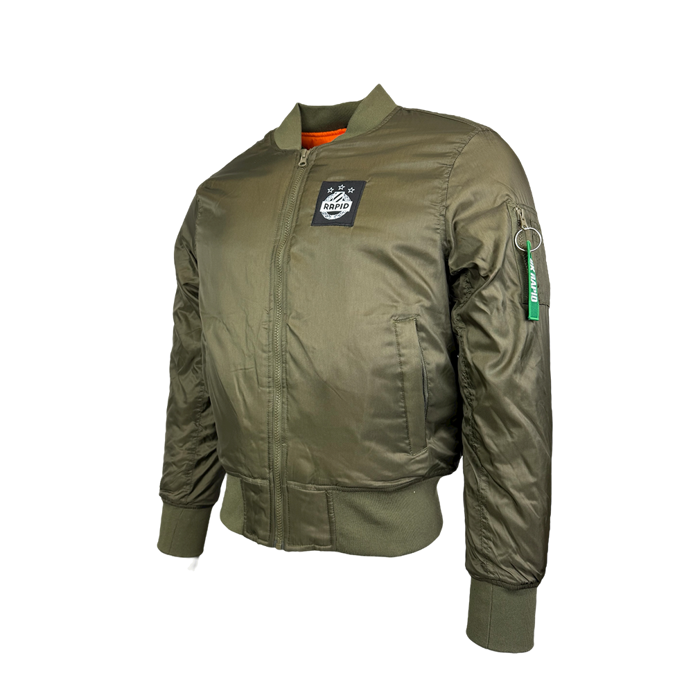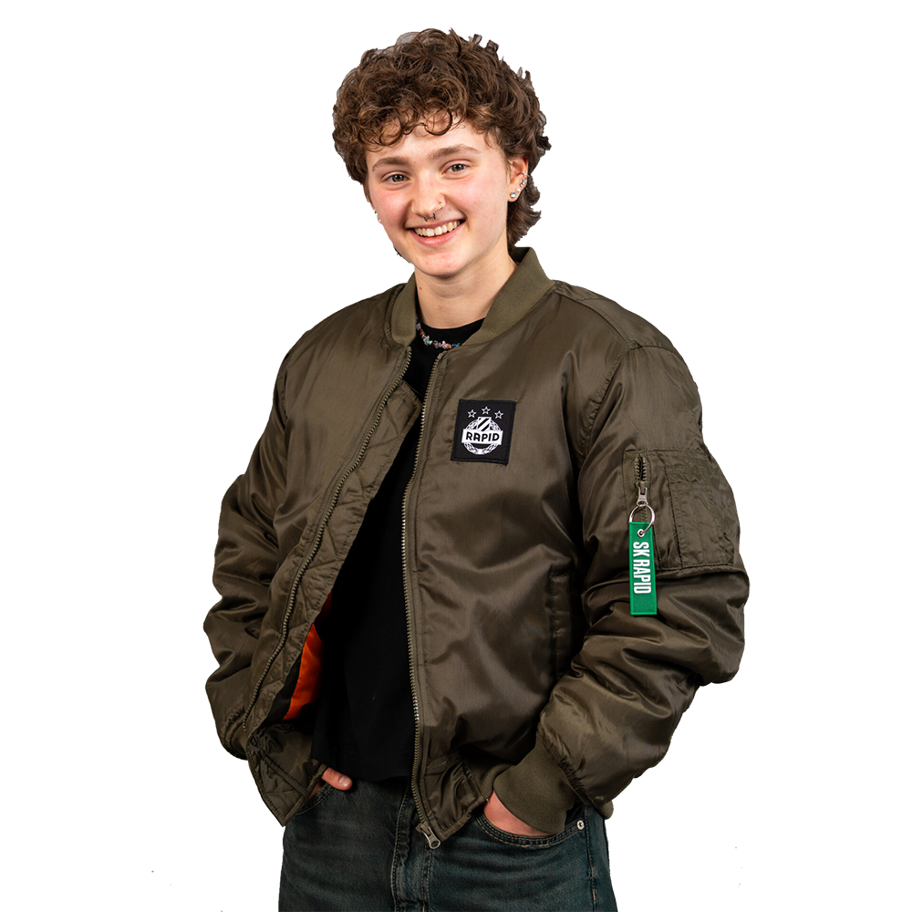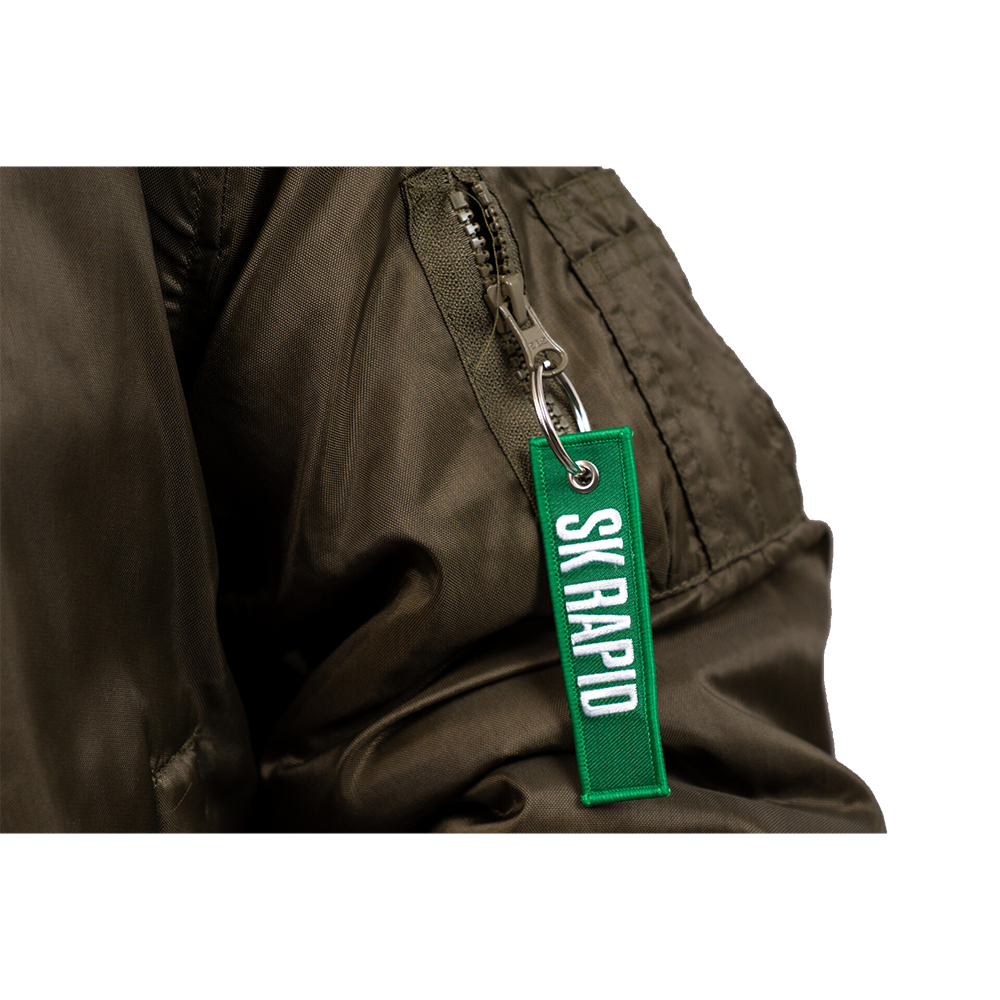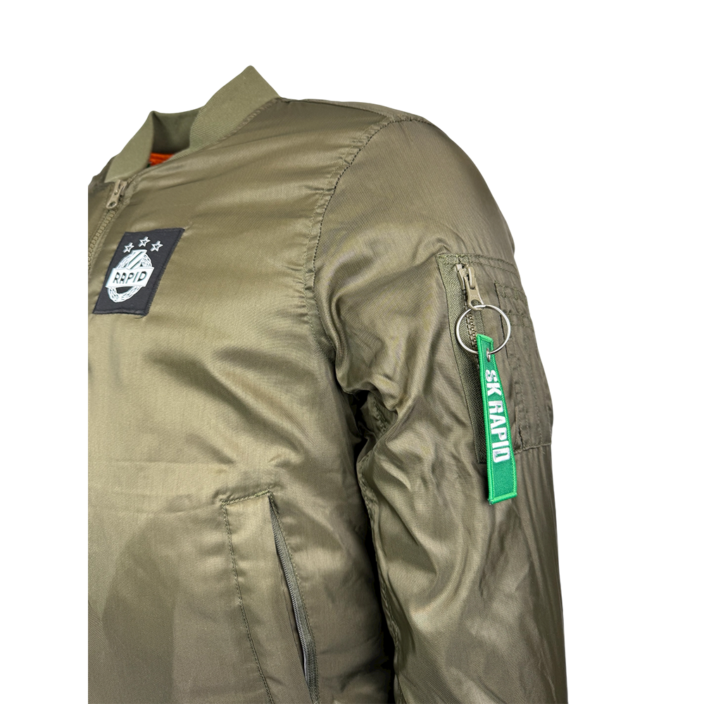 Modische SK Rapid Bomberjacke Stylische Bomberjacke mit SK Rapid-Patch und grünem Anhänger bei der Reißverschlusstasche am linken Ärmel. 2 Fronttaschen mit Reißverschluss