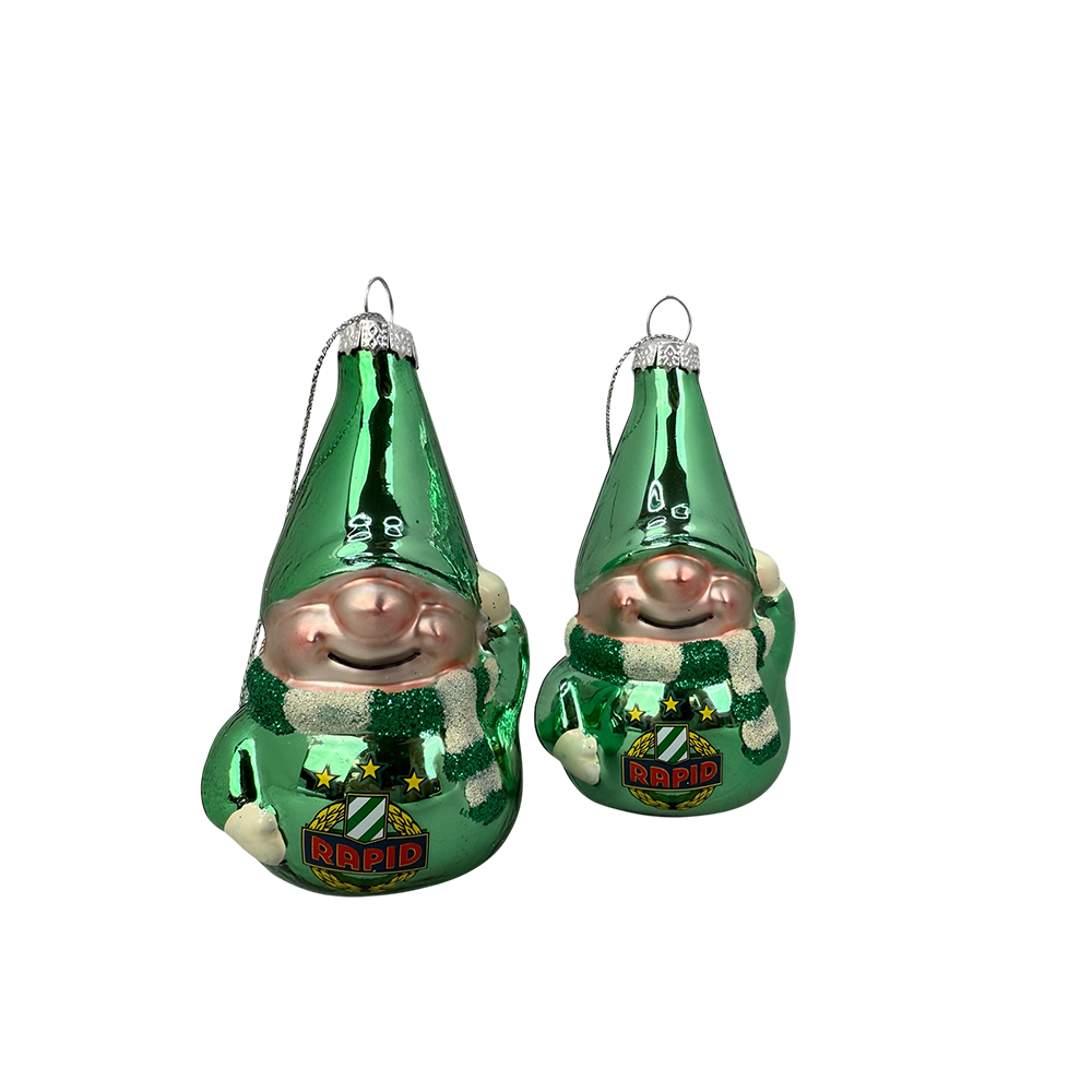 Set bestehend aus zwei Wichteln als Christbaumschmuck mit Rapid-wappen und Rapid-Schal.