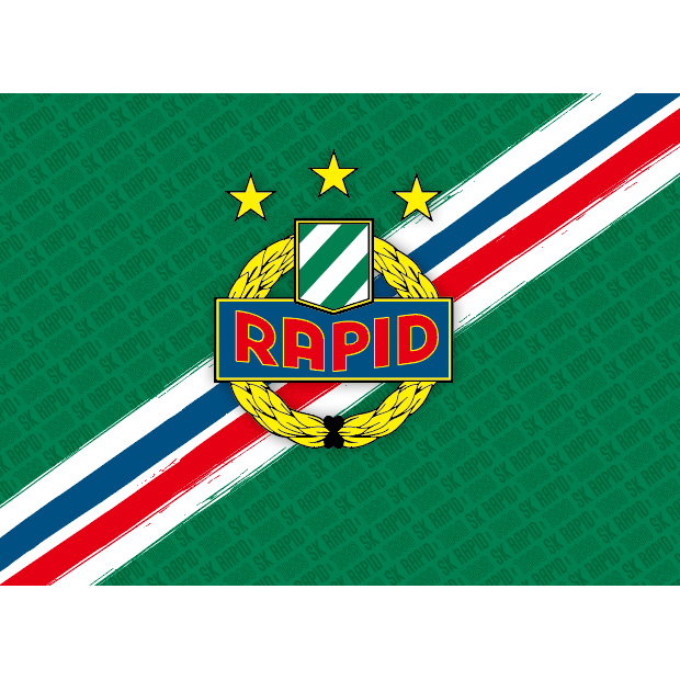 Grüne Fahne mit Rapid-Wappen und diagonalen Streifen in unseren Farben.