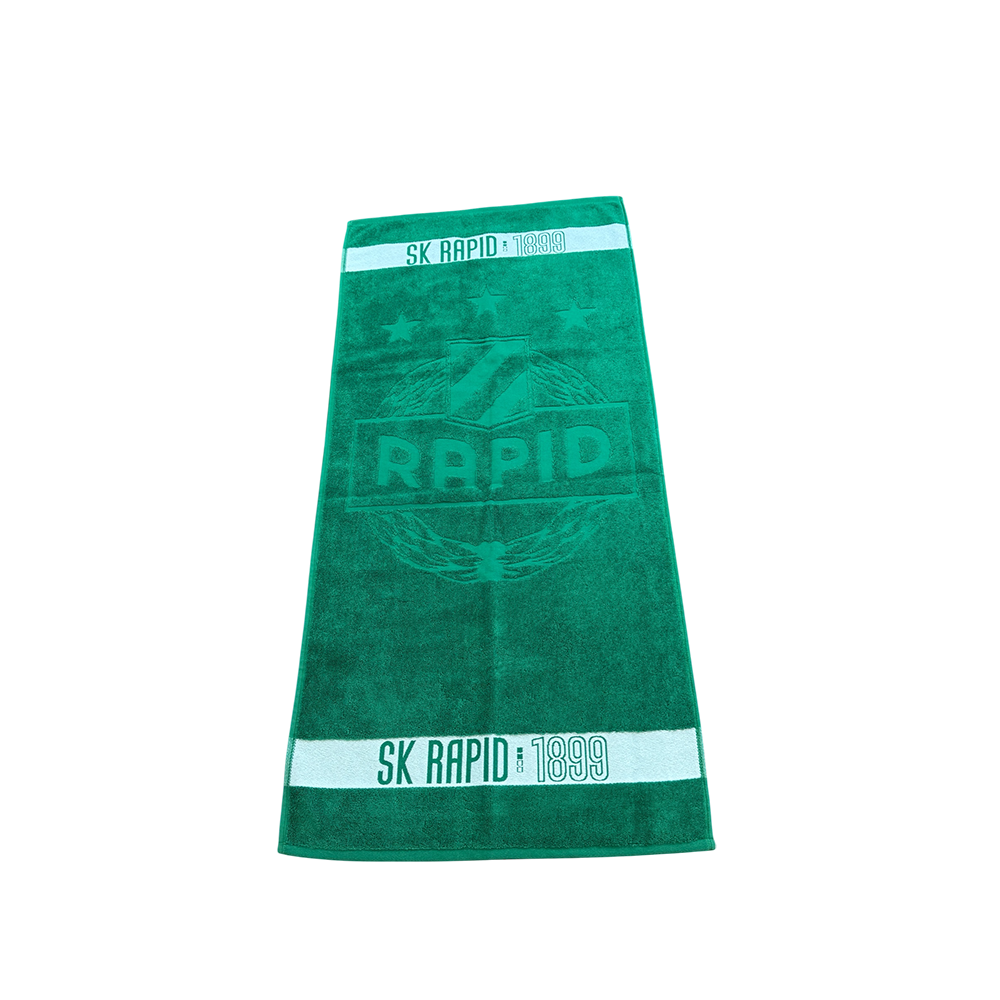 Grünes Handtuch mit geprägtem Rapid-Wappen und dem eingewebten Schriftzug SK Rapid 1899 in der weißen Bordüre.
