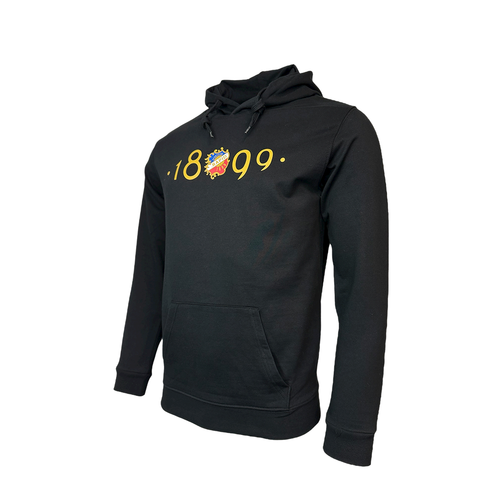 Schwarzer Kapuzenpullover mit Kängurutasche, innen angeraut, Strickbündchen an Ärmel und Saum.