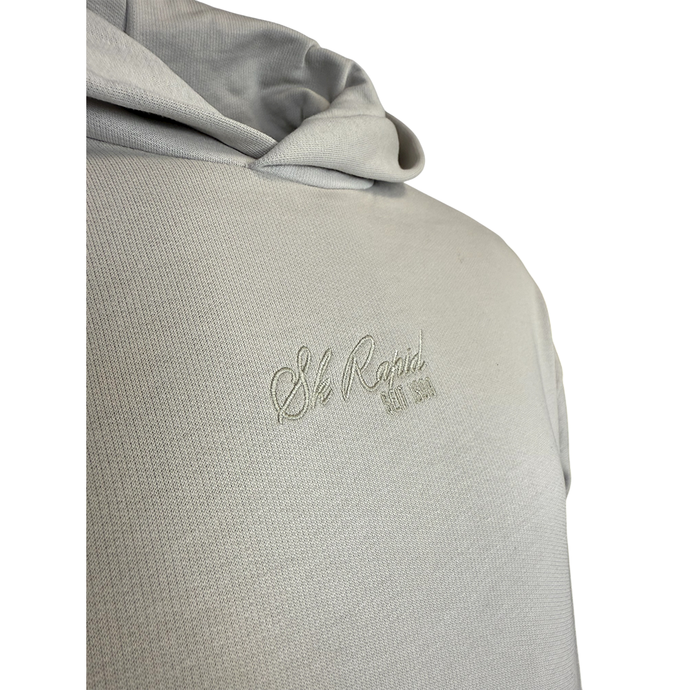 Oversized Hoodie mit dezentem SK Rapid Schriftzug. Elastikbund. Mit Reissverschlusstasche auf der rechten Seite vorne.