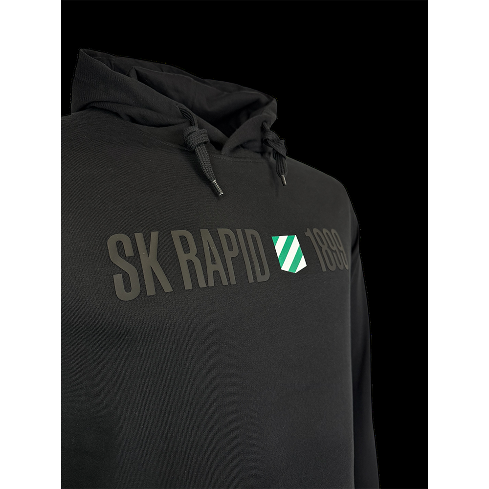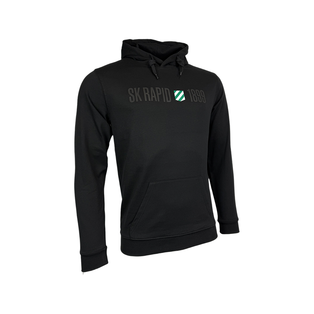 Stylischer Kapuzen Sweater in Schwarz mit SK Rapid 1899-Print auf der Vorderseite. Die gefütterte Kapuze ist mit einem Ton-in-Ton-Kordelzug versehen und bietet angenehmen Tragekomfort. Praktische Details wie eine innen angeraute Kängurutasche, sowie Strickbündchen an Ärmel und Saum machen diesen Hoodie zum perfekten Begleiter für Alltag und Freizeit.
