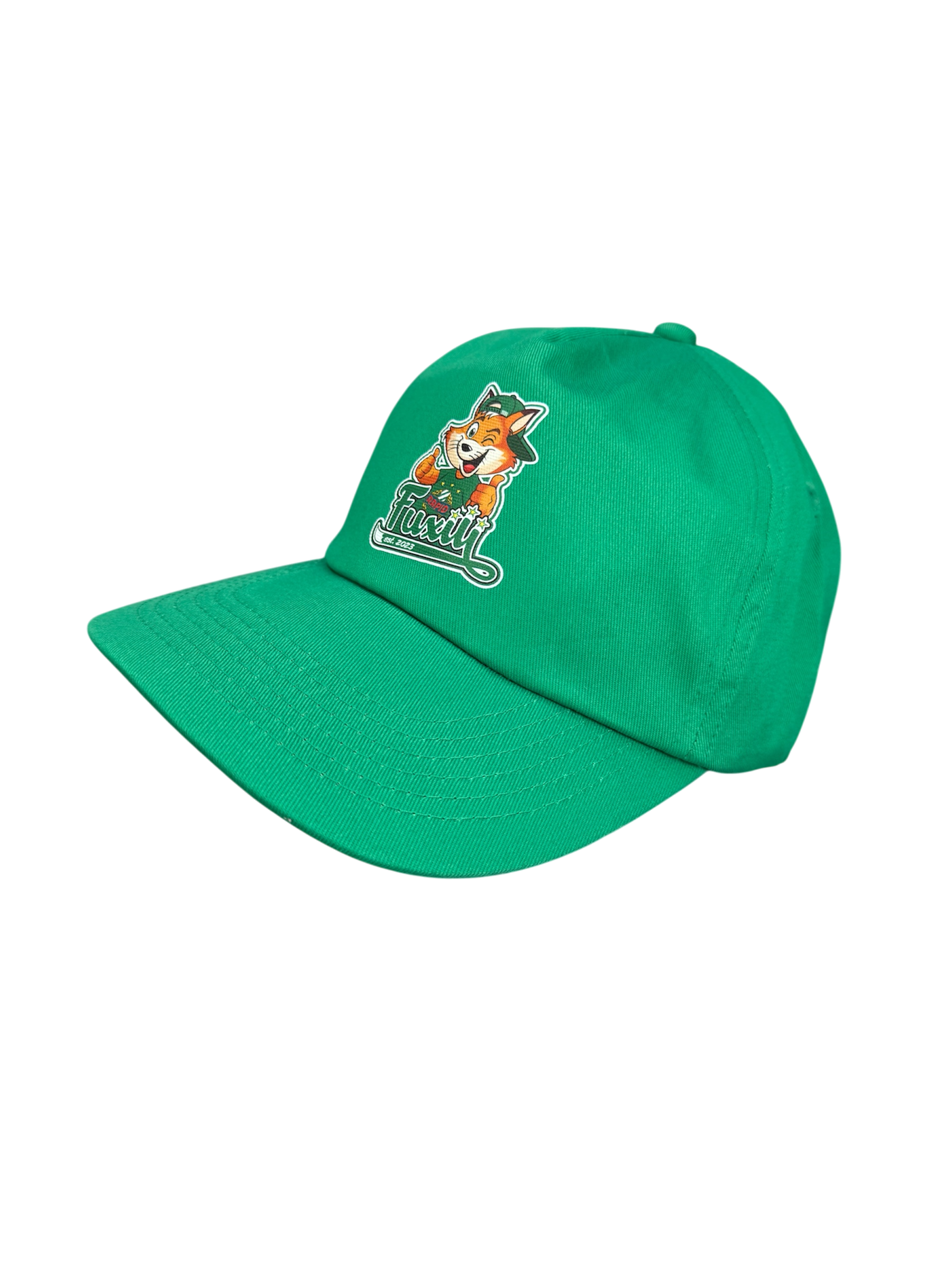Grüne Schirm-Kappe mit aufgedrucktem Fuxiii-Motiv.