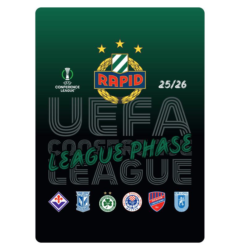 Schwarzer Magnet mit Rapid-Wappen und den restlichen Teilnehmern der UEFA conference league phase.