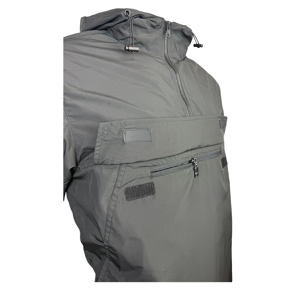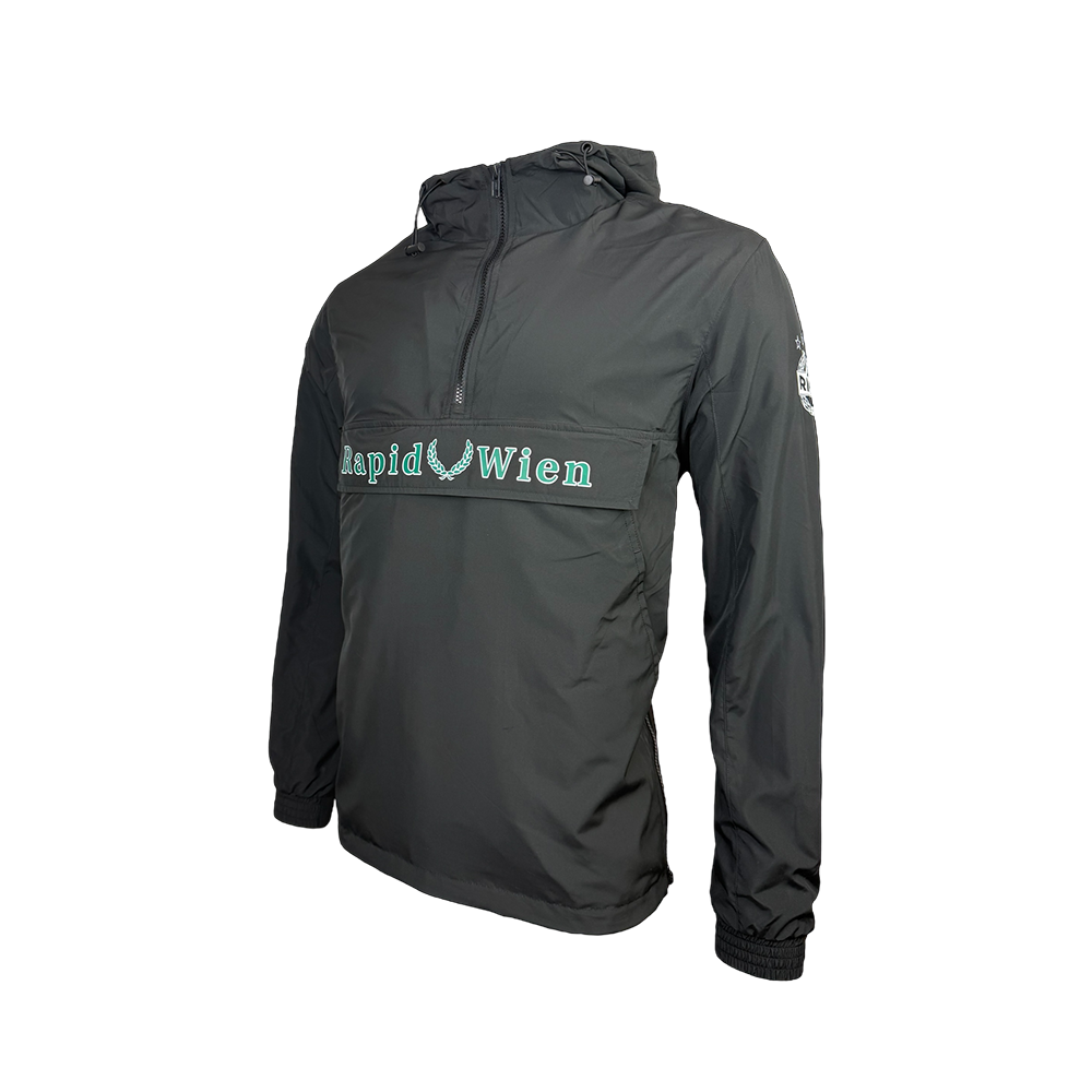 Schwarzer, bequemer Outdoor Kapuzenpullover mit grünem Rapid-Wappen am linken Ärmel und grünem Schriftzug "Rapid-Loorbeerkranz-Wien" auf der Vorderseite. Brusttasche mit Reißverschluss, zwei Seitentaschen mit Klettverschluss und Innenfutter.
