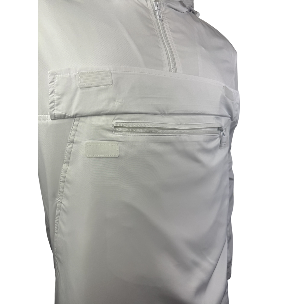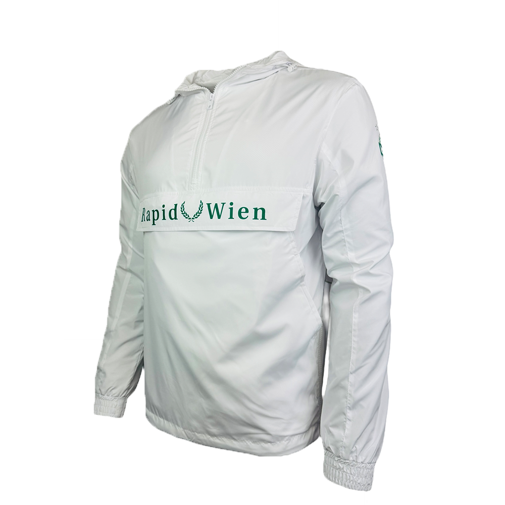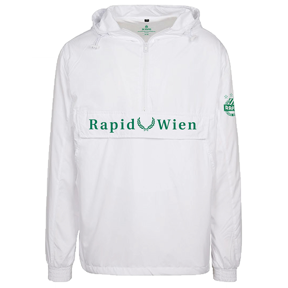Weißer, bequemer Outdoor Kapuzenpullover mit grünem Rapid-Wappen am linken Ärmel und grünem Schriftzug "Rapid-Loorbeerkranz-Wien" auf der Vorderseite. Brusttasche mit Reißverschluss, zwei Seitentaschen mit Klettverschluss und Innenfutter.