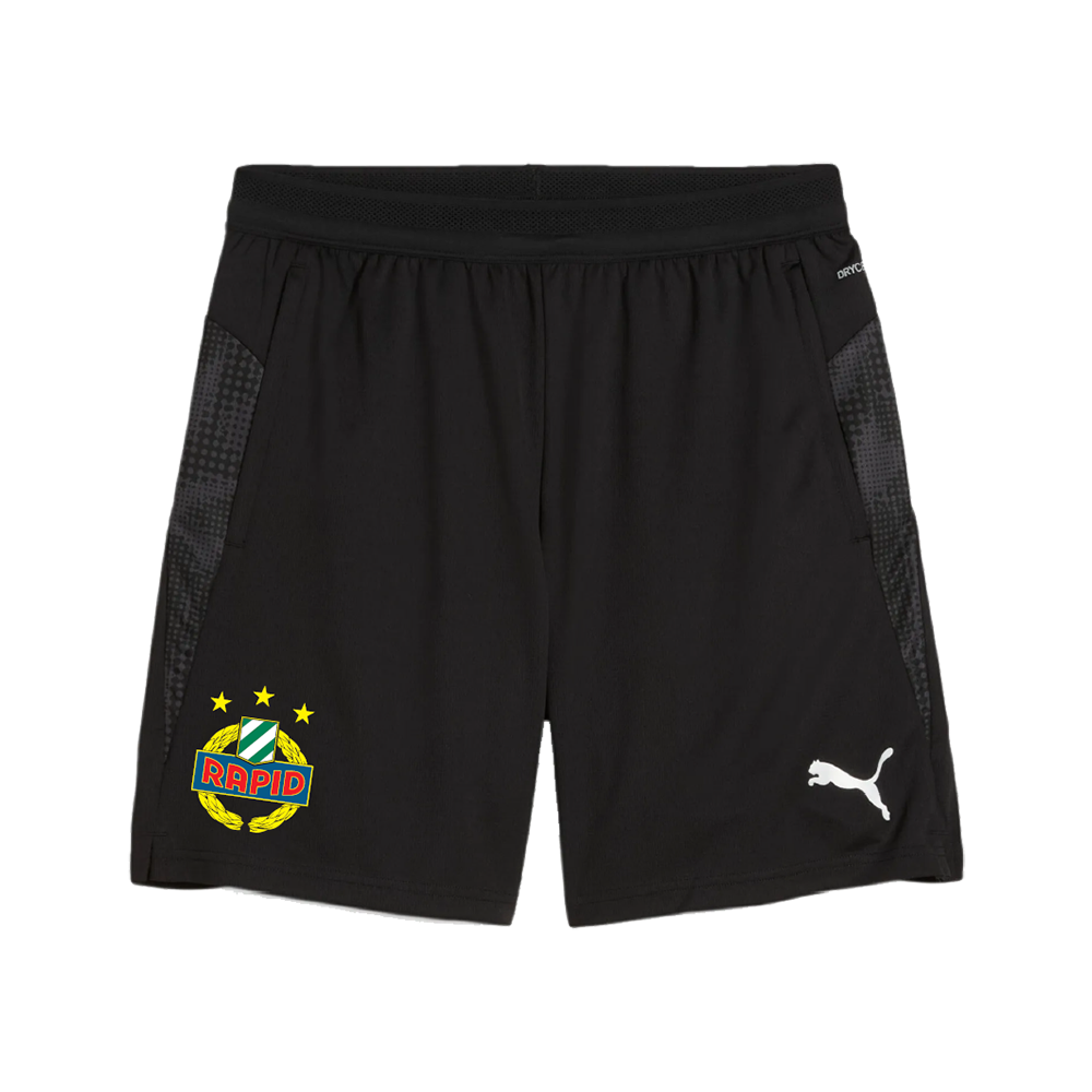 Schwarze Trainingsshort mit Rapid-Wappen und zwei Reißverschlusstaschen. Die Short ist atmungsaktiv, super bequem und schweißableitend, außerdem bietet sie eine hohe Strapazierfähigkeit, damit ihr bestens für jede Trainingseinheit ausgestattet seid. Die änderbare Passform der Short wird durch einen Gummizug und einen Kordelzug geschaffen.