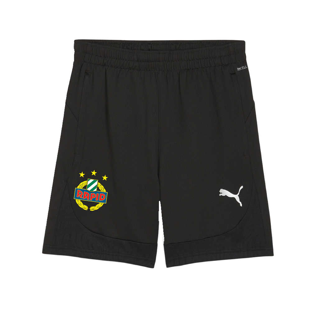 Schwarze Trainingsshort mit Rapid-Wappen und zwei Reißverschlusstaschen. Die Short ist atmungsaktiv, super bequem und schweißableitend, außerdem bietet sie eine hohe Strapazierfähigkeit, damit ihr bestens für jede Trainingseinheit ausgestattet seid. Die änderbare Passform der Short wird durch einen Gummizug und einen Kordelzug geschaffen.