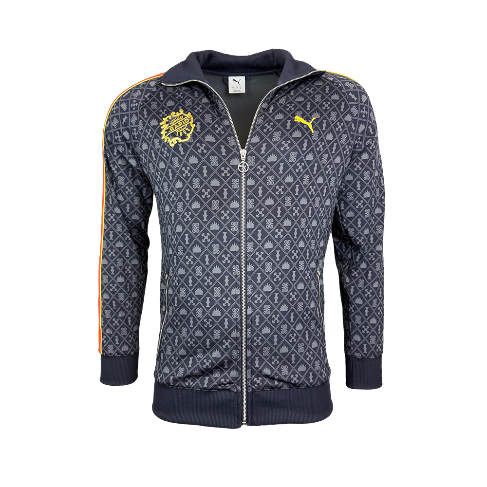 Diese moderne Puma-Jacke in den Gründungsfarben des SK Rapid ist ein echtes Statement-Piece für alle, die Tradition mit Stil verbinden wollen. In sattem Blau mit markanten roten Streifen an den Ärmeln und veredelt mit dem goldenen Gründungswappen des SK Rapid, vereint sie klassische Sportsilhouette mit auffälligen Farben, Prints und Mustern. Funktionale Reißverschlusstaschen an den Seiten sorgen für praktischen Stauraum.