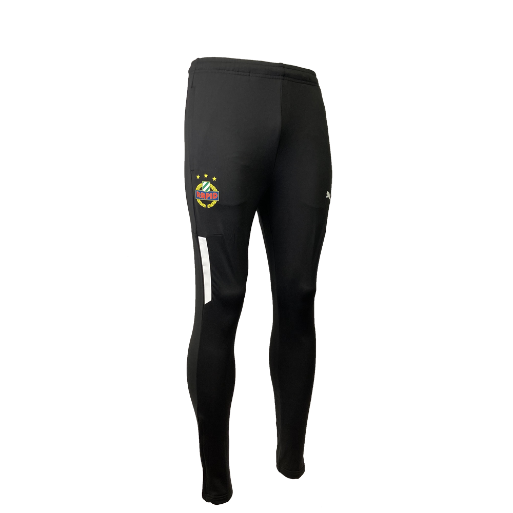 Schwarze Trainingshose mit Rapid-Wappen, zwei Reißverschlusstaschen.