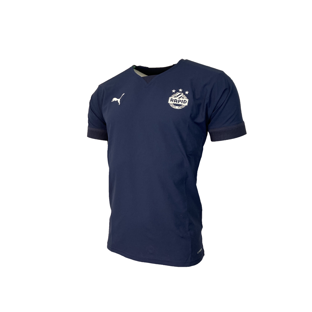 Sehr hochwertigs und sehr leichtes blaues Jersey mit elastischen Bündchen und Kragen, eingearbeitetem Muster für maximale Bewegungsfreiheit, sowie einem Rapid-Wappen, atmungsaktiv und schweißableitend. Dieses TeamFINAL Trikot-Jersey ist aus leichtem receyceltem Gewebe in Ripstop-Struktur und 4-Wege-Stretch für Gewichtsreduzierung, mühelose Bewegungen und optimale Leistung wie ein Profi, transportiert Feuchtigkeit nach außen und sorgt für einen trockenen Tragekomfort.