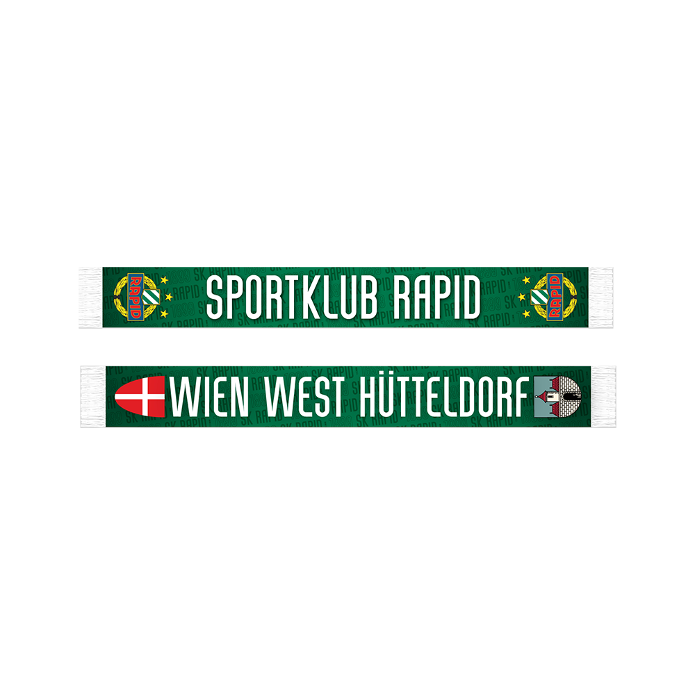 Druckschal mit Rapid-Wappen und Aufdruck SPORTKLUB RAPID auf der einen Seite und WIEN WEST HÜTTELDORF mit Wien- und Hütteldorf-Wappen auf der Anderen.