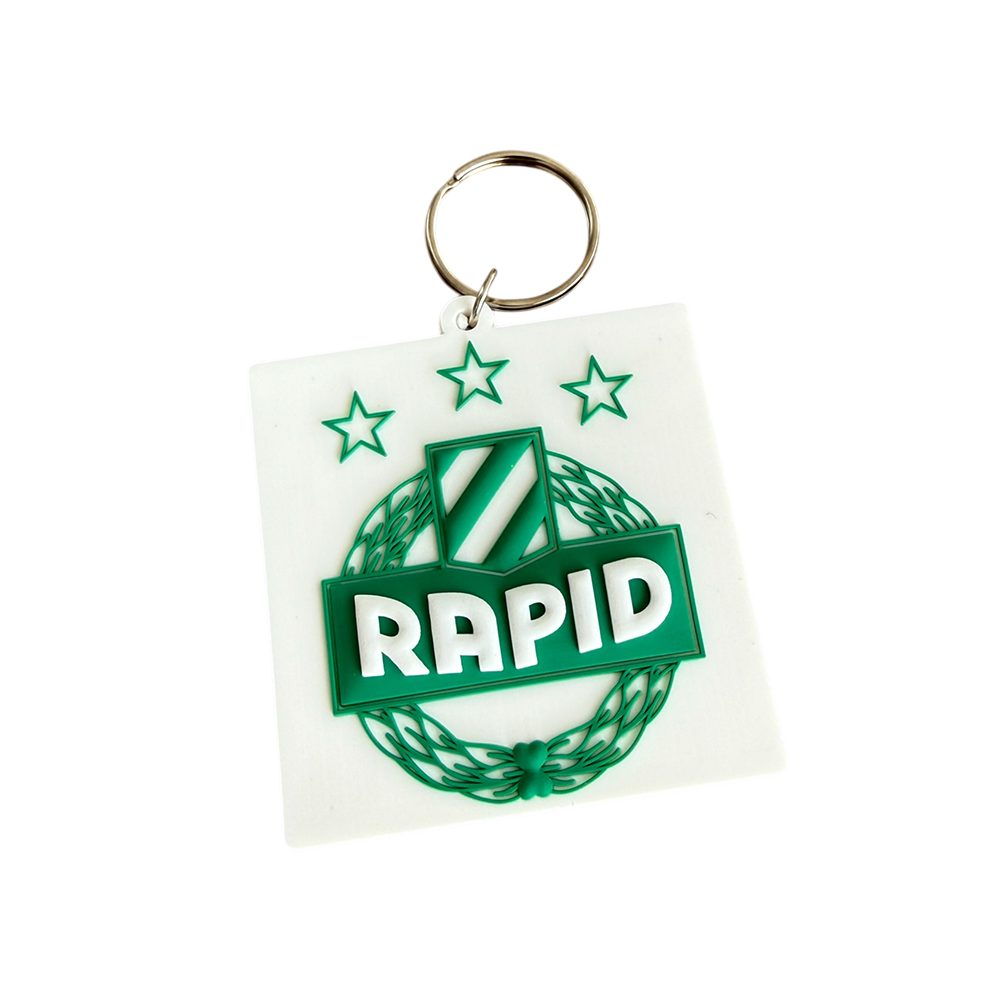 Weißer Gummipatch mit grünen 3D-Rapid-Wappen.