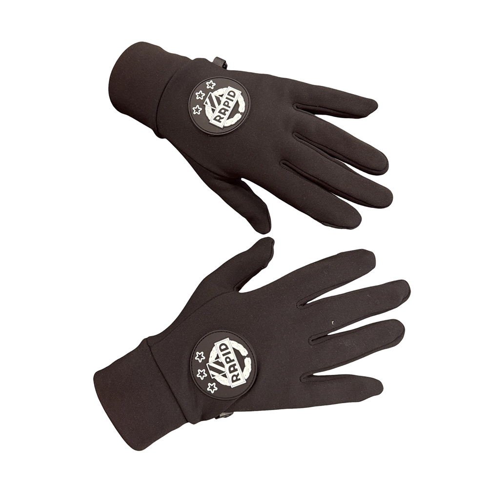 Schwarze Softshell-Handschuhe mit weißem Rapid-Wappen am Handrücken. Touch Funktion an jeweils 3 Fingern pro Seite.