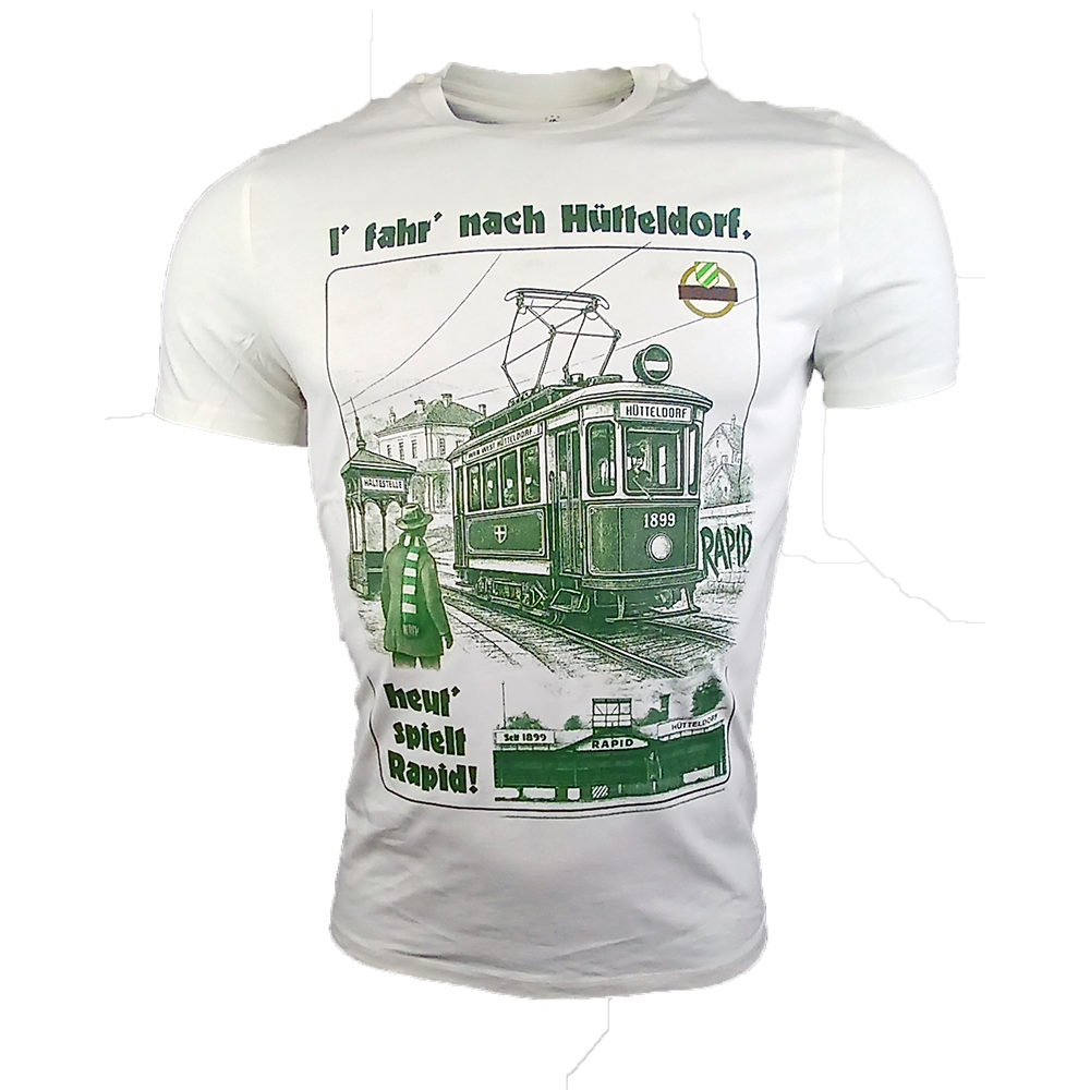 Ein Stück Wiener Geschichte auf Stoff: Dieses T-Shirt zeigt eine liebevoll illustrierte, fiktive alte Wiener Straßenbahn mit grün-weiß-grüner Zielscheibe – so, wie sie einst Richtung Hütteldorf unterwegs war, lange bevor Liniennummern eingeführt wurden.
