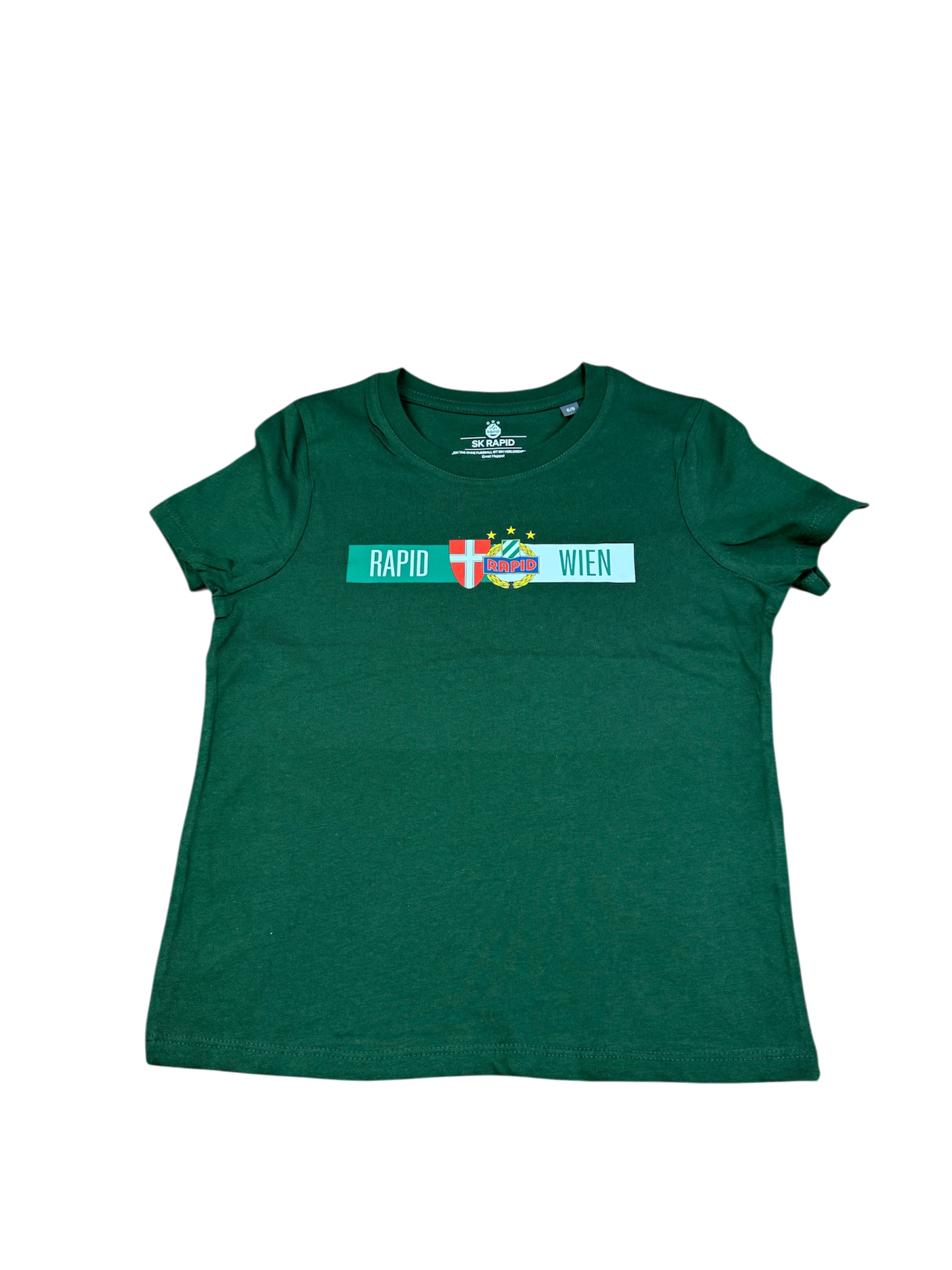 Grünes T-Shirt mit waagrechtem Balken RAPIDxWIEN und den Wappen von RAPID und Wien.