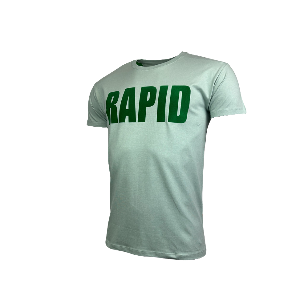 Umweltfreundliches T-Shirt mit Flock-Aufdruck RAPID. Das Shirt bietet ein angenehmes Tragegefühl und überzeugt durch seinen körpernahen Schnitt mit Strickbündchen an Halsausschnitt. Perfekt für alle, die ihren Rapid-Stolz bequem und modisch zeigen möchten!