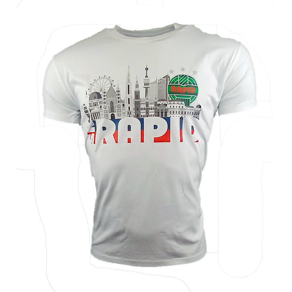 Weißes T-Shirt mit der Skyline von Wien und dem Schriftzug SK RAPID in weiß auf rot/blauem Hintergrund. Auf der Rückseite ist ein Rapid Wappen.