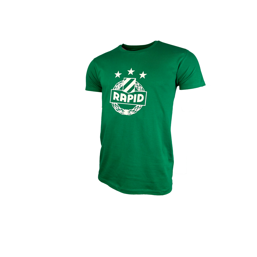 Grünes T-Shirt mit weißem 3D-Wappen.