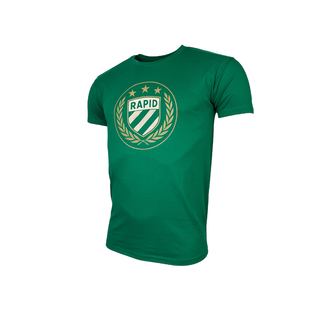 Grünes T-Shirt mit Rapid Wappen im Lorbeerkranz.