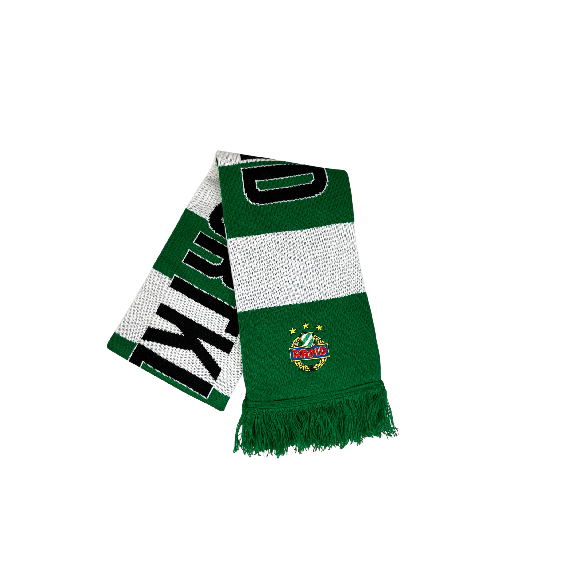 Grün-weiß gestreifter Webschal mit gesticktem Rapid-Wappen und dem Schriftzug SPORTKLUB RAPID.