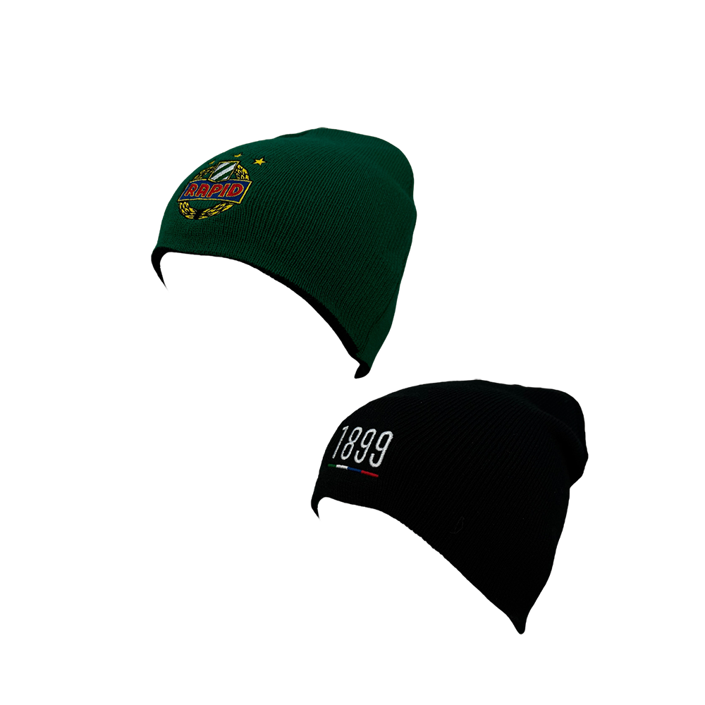 Wendehaube bestehend aus schwarzer Haube mit Schriftzug 1899 und grüner Haube mit Rapid-Wappen.